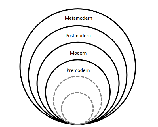 “As this diagram suggests, all the prior epistemes continue to live on within metamodern culture—but are no longer the driving cultural logic. The metamodern perspective thus contains the postmodern, as well as the pre-postmodern, as enduring modalities available to it. Indeed, from its vantage, the metamodern is able to toggle between these different modalities. Like a browser with many tabs, or a hypertext with many links, the metamodern can move through many different windows.” (p.14) [emphasis mine]