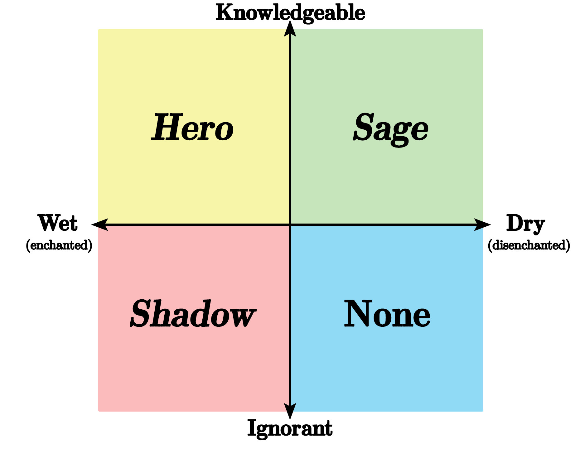 What Ferry and Renaut’s book gave me was a dry look at the topic. That’s where our diagram comes in. Because I’d only have to ask my brother’s opinion on Postmodernism and hear him say “What? Nobody cares” and we’d have a good image of the dry-ignorant lower corner. That doesn’t tell us much about anything except that some people don’t care about philosophy (a fact that cannot have escaped anyone with the mildest interest in philosophy).